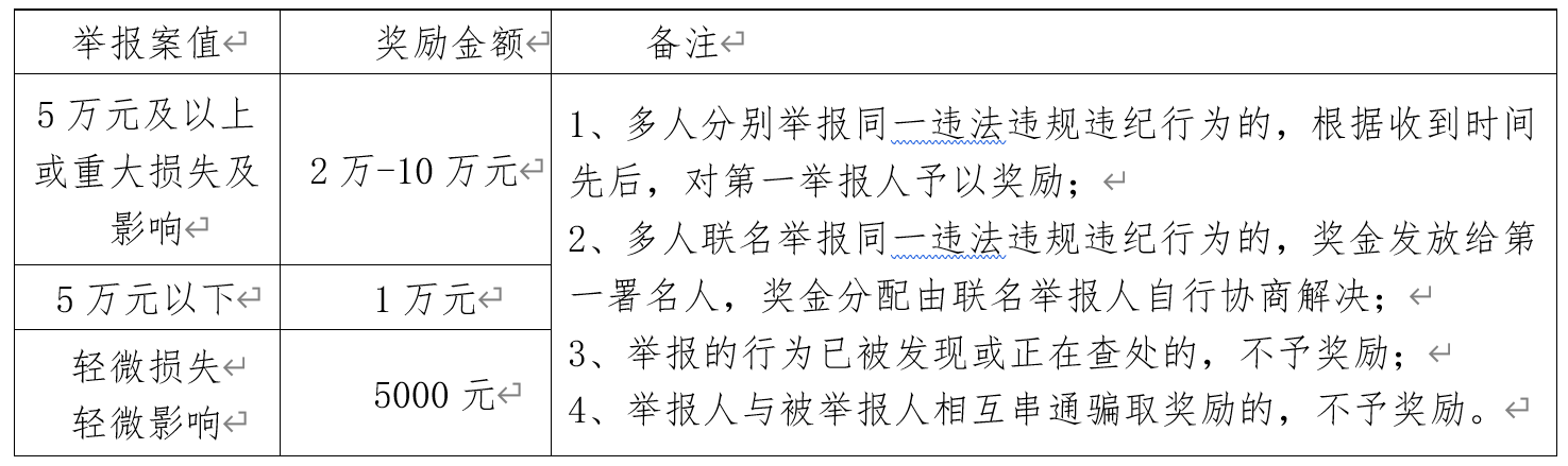三、舉報內(nèi)容一經(jīng)查實,公司給予舉報人獎勵,具體標(biāo)準(zhǔn)如下表所示:
