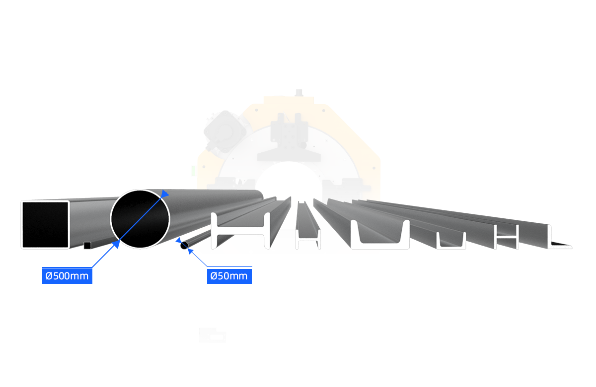 可加工管材重量≤1500KG,圓管直徑范圍50-500mm,管材長度12000mm;